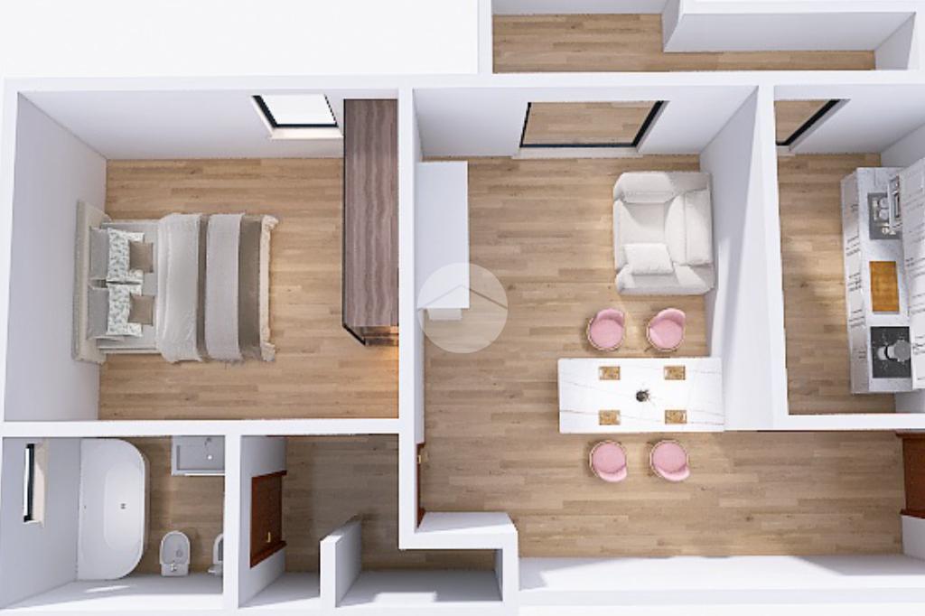 Dall'ingresso si accede al luminoso living dell'abitazione, organizzato in un cucinotto abitabile e in un comodo soggiorno con affaccio su un terrazzino pranzabile, fruibile anche dalla cucina. La zona giorno, inoltre, dispone di climatizzazione autonoma.