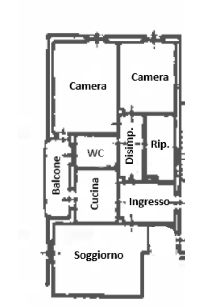 Gli infissi esterni, originali, sono in legno bianco, con vetro singolo e i pavimenti in graniglia. Le finestre sono munite di tapparelle con fermo di sicurezza.