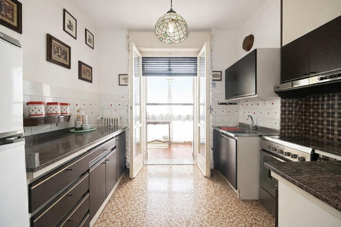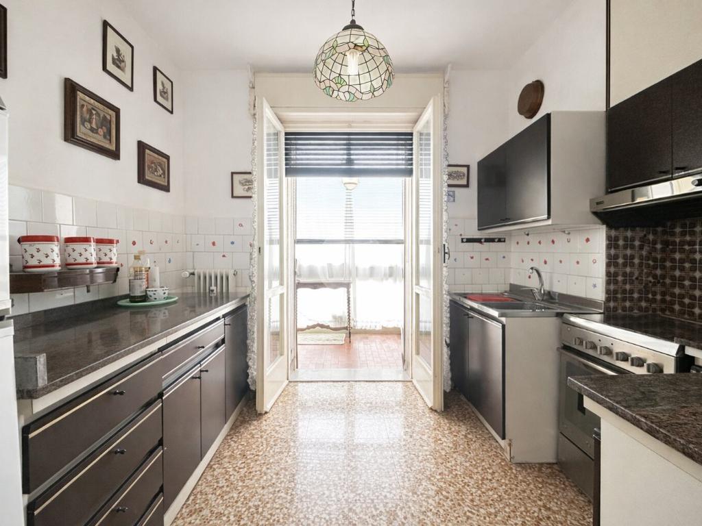 La cucina, abitabile, dispone di accesso al balcone, su cui affacciano anche il living e una delle due camere matrimoniali.