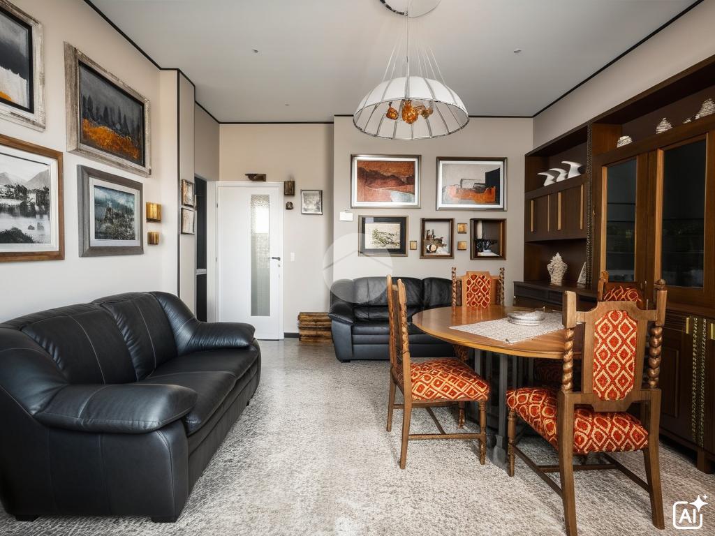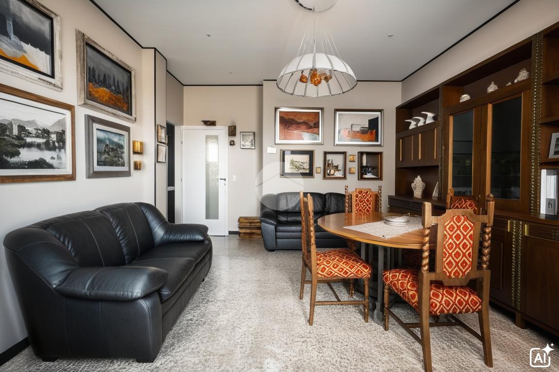 Il soggiorno ospita un tavolo da pranzo e due comodi divani per conversare.